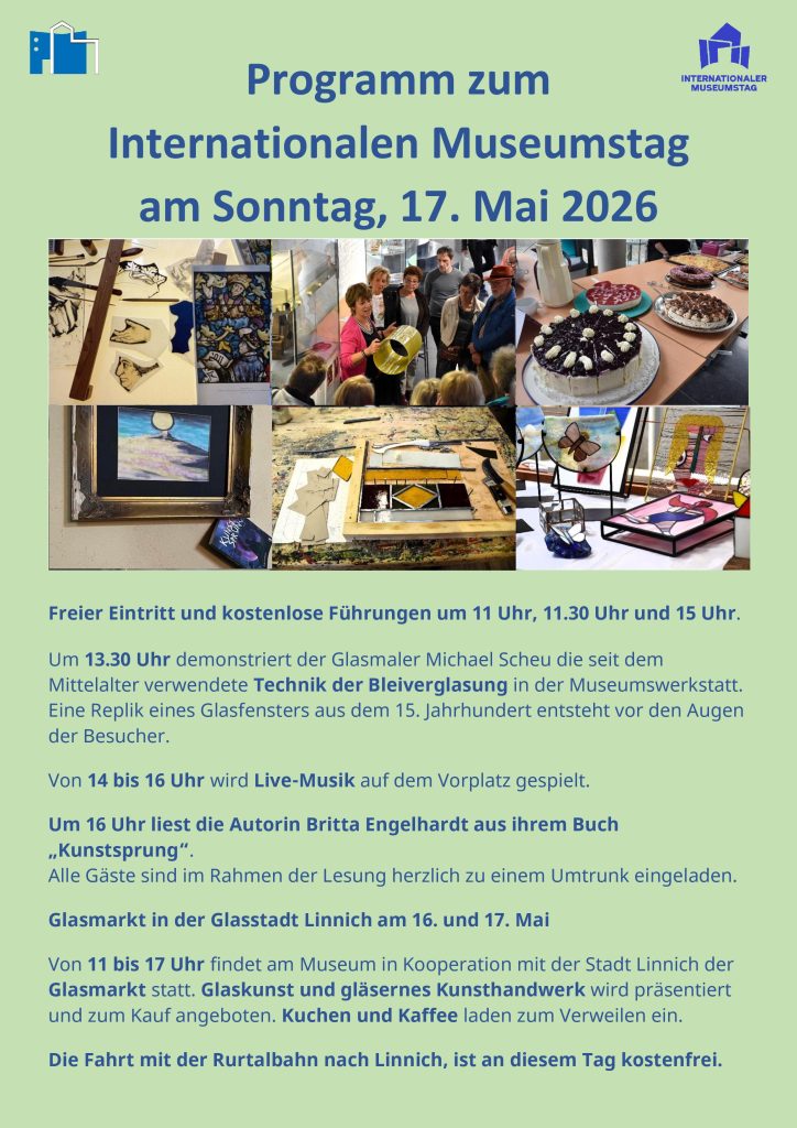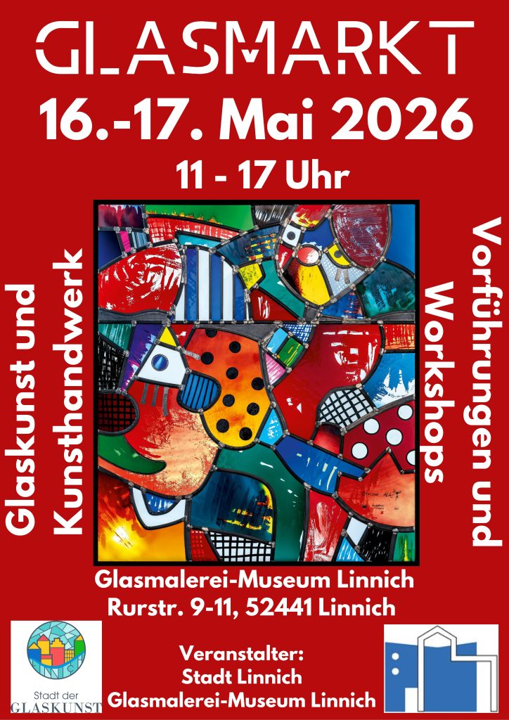 Von 11 bis 17 Uhr findet am Museum in Kooperation mit der Stadt Linnich der Glasmarkt statt. Glaskunst und gläsernes Kunsthandwerk wird präsentiert und zum Kauf angeboten. Ein Kuchenbuffet mit Kaffee und Tee lädt zum Verweilen ein.